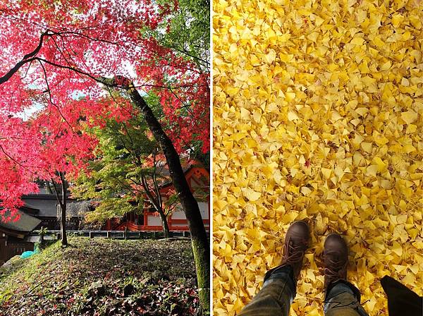 火燒般艷麗的紅葉、從樹枝頂端到地上鋪滿澄黃的銀杏葉,